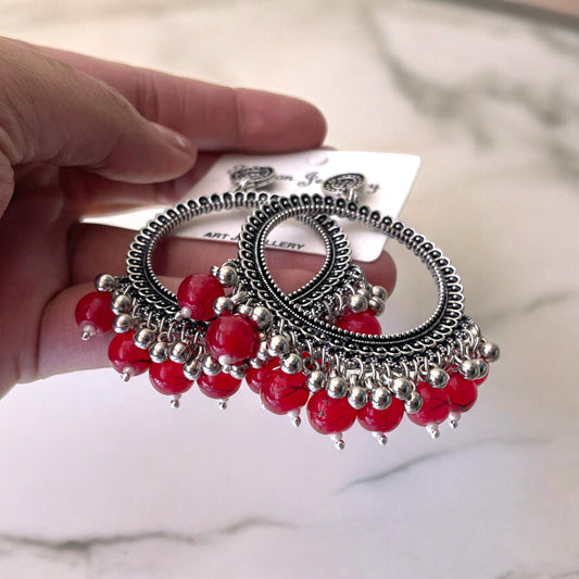 JB71 - Silver Circle Oxidised Earring (Red Beads) For Resin Art
