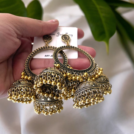 JB74 - Tri Jhumka Golden Circle Oxidised Earring (XL)