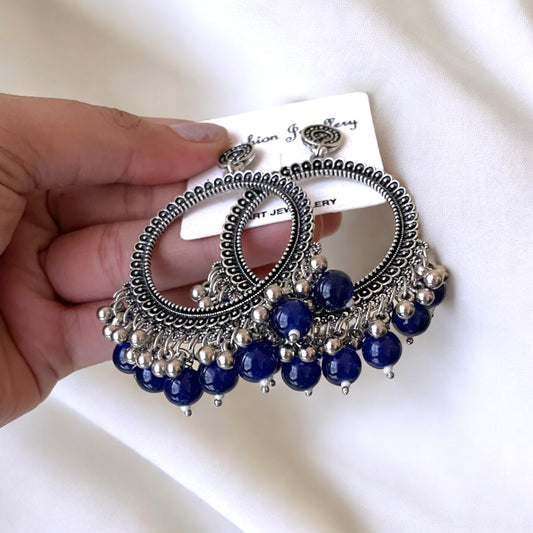 JB72- Silver Circle Oxidised Earring (Navy Blue Beads) For Resin Art