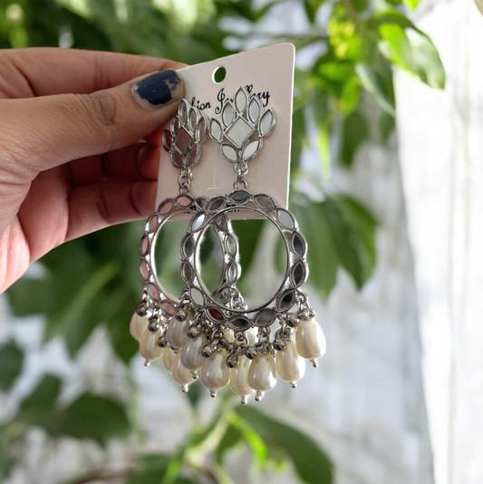 JB74 - Pearl Glass Beads Silver Mirror Earring - Best Quality