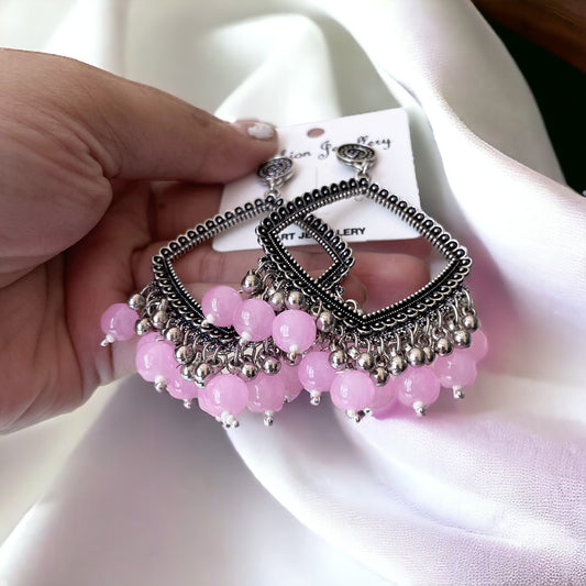 Silver Rhombus Oxidised Earring (Pink Beads) For Resin Art