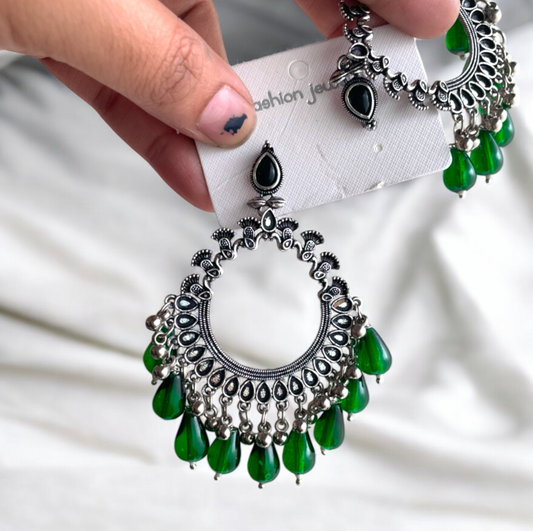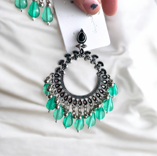 JB45 - Silver Peacock Motif Oxidised Earring (Green Beads) For Resin Art - Best Quality