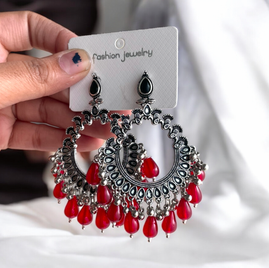 JB44 - Silver Peacock Motif Oxidised Earring (Red Green Beads) For Resin Art - Best Quality