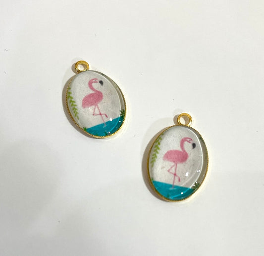 GN025 - Pack of 2pcs - Pink Flamingo - Glass Pendants with Metal Base