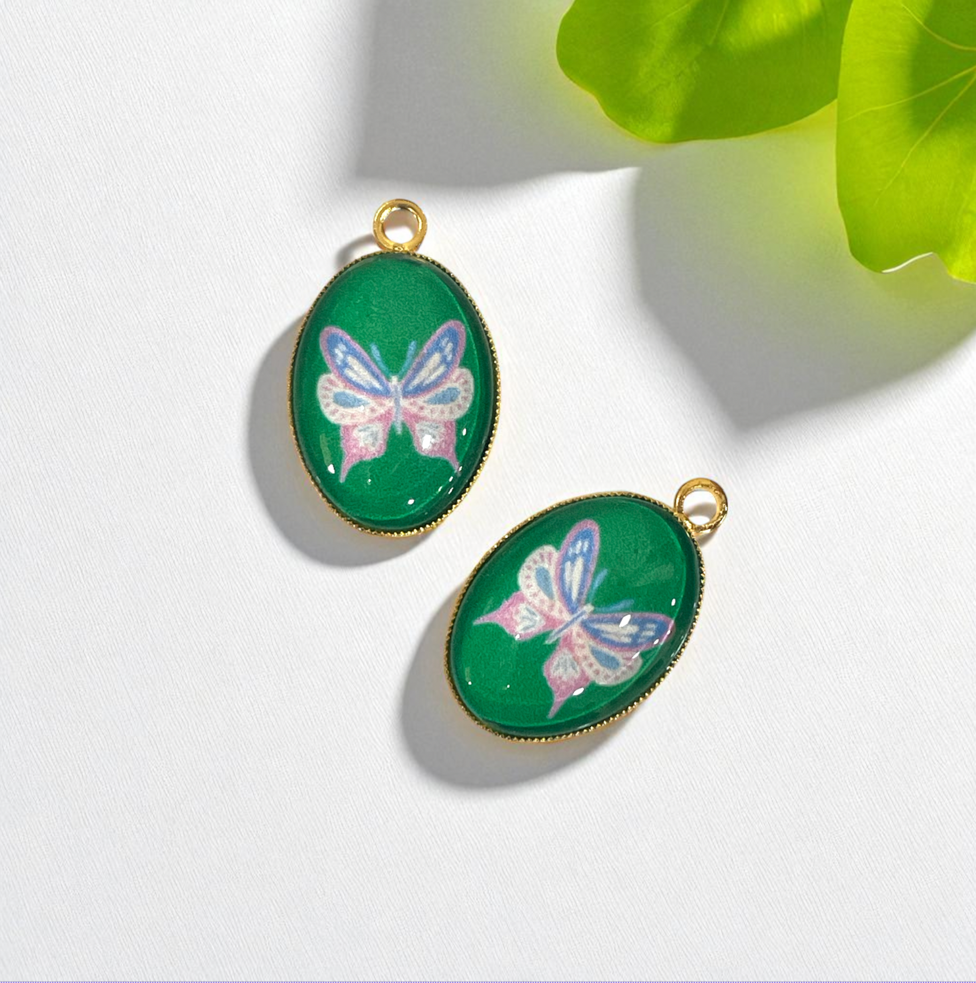 GN01 - Pack of 2pcs - Green Butterfly - Glass Pendants with Metal Base