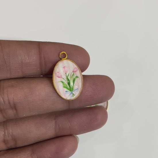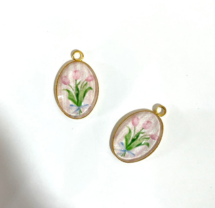 GN021 - Pack of 2pcs - Pink Tulips - Glass Pendants with Metal Base