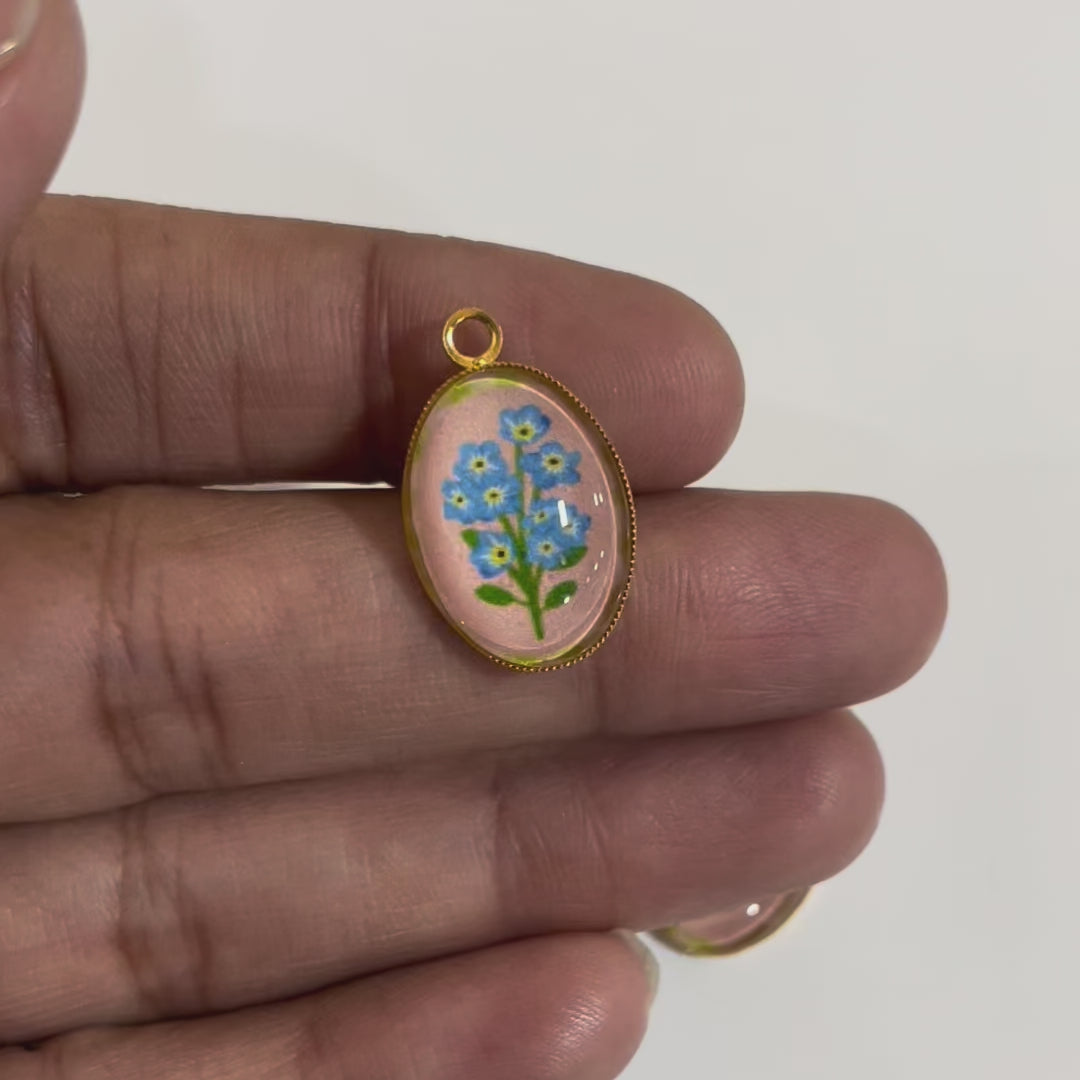 GN027 - Pack of 2pcs - Blue Flowers - Glass Pendants with Metal Base