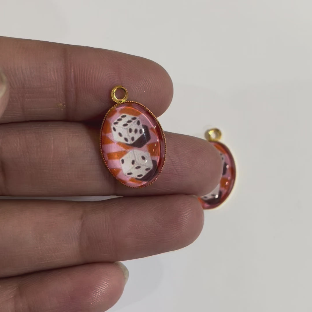 GN028 - Pack of 2pcs - Vintage Dice Play - Glass Pendants with Metal Base