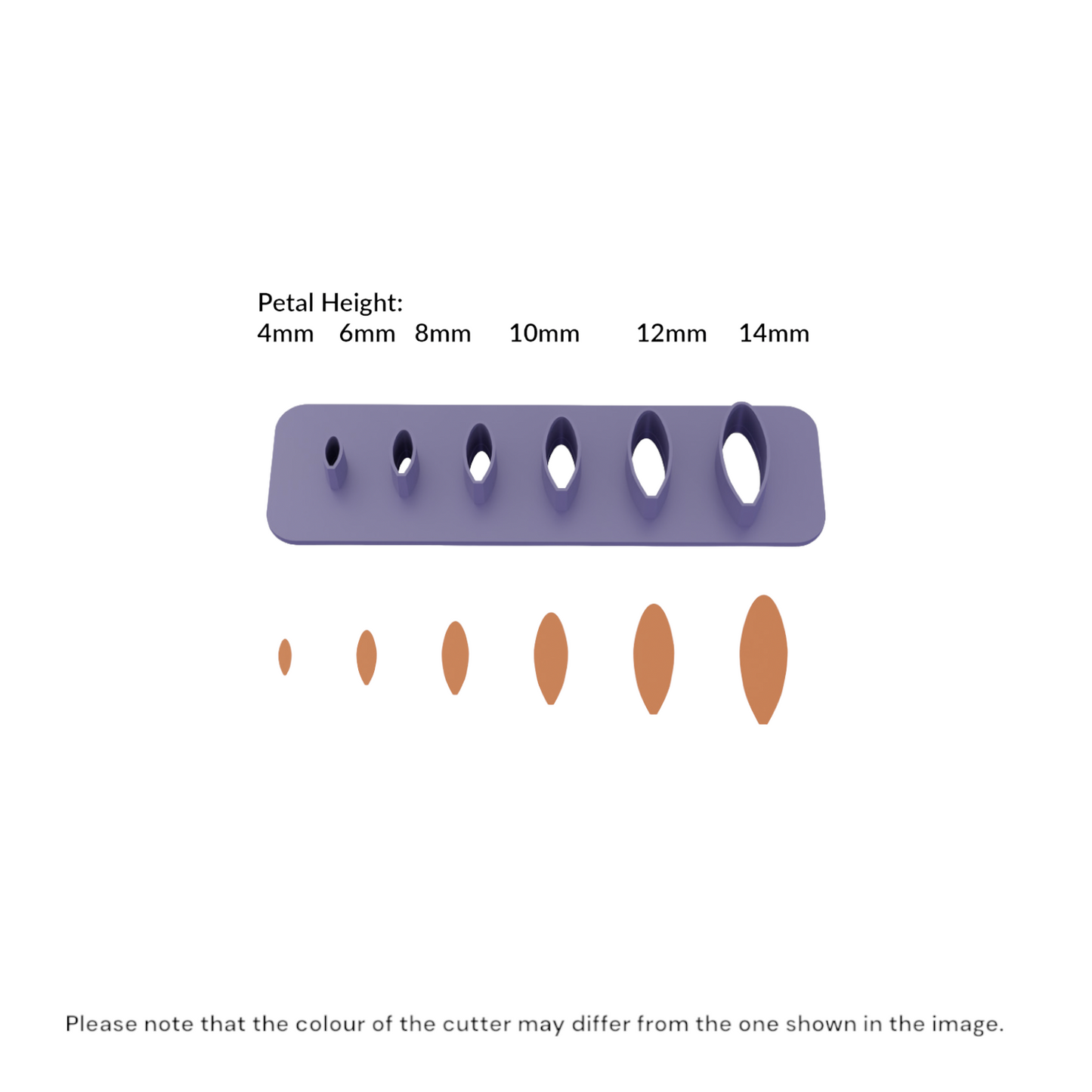 Each strip contains six sizes of each petal - 4mm, 6mm, 8mm, 10mm, 12mm and 14mm in height. The cutters have sharp 0.4mm cutting edge, 7mm total height, comfortable top surface with rounded edges and secure overhang for lifting them.
